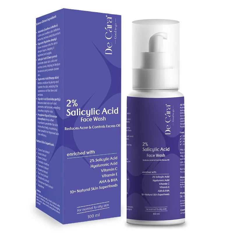 De Cara’s 2% Salicylic Acid Face Wash is a gentle formula designed to deeply cleanse and unclog pores, ideal for acne-prone skin. Its infused with Hyaluronic Acid, Allantoin, and Glycerin, it hydrates and soothes while maintaining the skin’s moisture balance. Its also enriched with natural extracts like Green Tea, Amla, Neem, Centella Asiatica, Turmeric, Rosehip, Tea Tree, Soapbark, and Cinnamon Bark, it provides antioxidant protection, reduces inflammation, and supports skin healing for a refreshed, clear complexion.