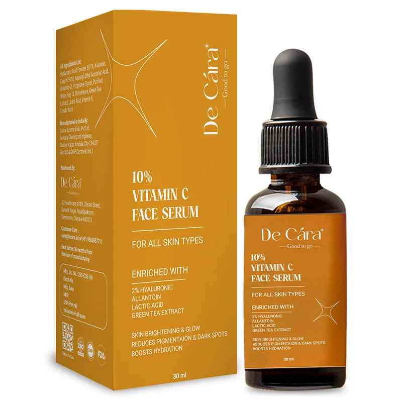 De Cara’s 10% Vitamin C face serum brightens and evens skin tone for delivering hydration and nourishment for all type of skins. Its enriched with 2% Hyaluronic Acid which locks in moisture for plump, dewy skin. Allantoin soothes and calms irritation along with gently exfoliates for a smoother texture by Lactic Acid. Green Tea Extract provides antioxidant protection, fighting free radicals and reducing signs of aging. Together, these powerful ingredients combination creates a revitalizing serum that promotes a radiant, youthful complexion always.